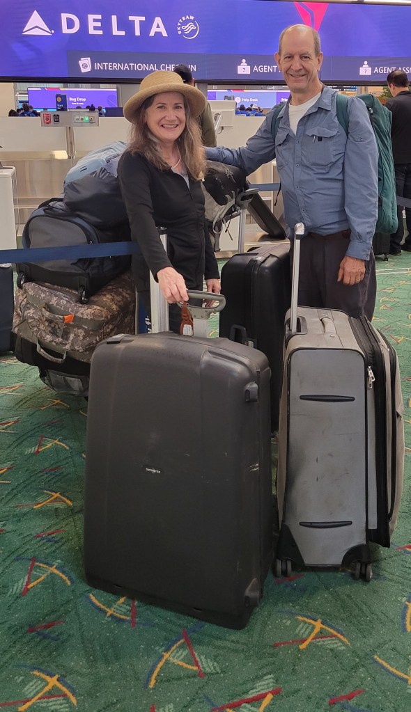 It’s really happening! Here we are at the “new and improved” PDX, ready to move out of the country. Six pieces of luggage sounds like a lot, until you decide you can’t live without your folding bicycles (2), your inflatable kayak, and your 50 pounds of tools and boat parts. That means one bag apiece for snorkel gear, technology, boat boots, inflatable life jacket, foul weather gear, and –oh that’s right– clothing.