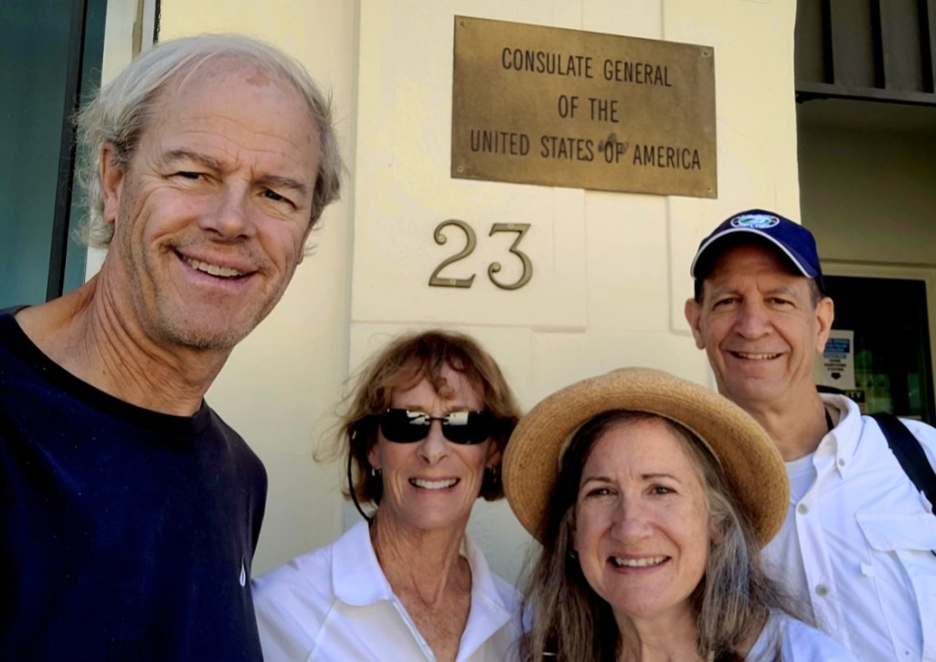 When we arrived in Barcelona to take possession of Quintessa, we found that every single detail of the boat was in meticulous shape, as the Knapps had continued to spend the summer making improvements to her already beautiful condition. Then we spent a couple of intense days together as Sara and Bob showed us every detail of that boat and her systems, explaining with great patience (to these two jet-lagged souls) how to care for her so that she would care for us. We traveled to the U.S Consulate (see photo above) to sign and notarize the papers transferring ownership, and then returned to Quintessa to toast the event with cava.