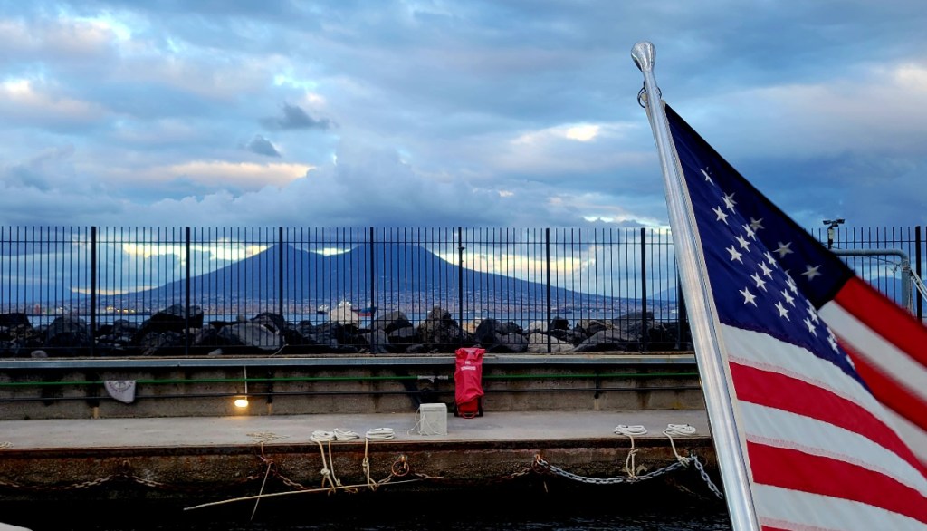 To the east, dawn came this morning over cloud-capped Vesuvius, so close it fills the horizon.