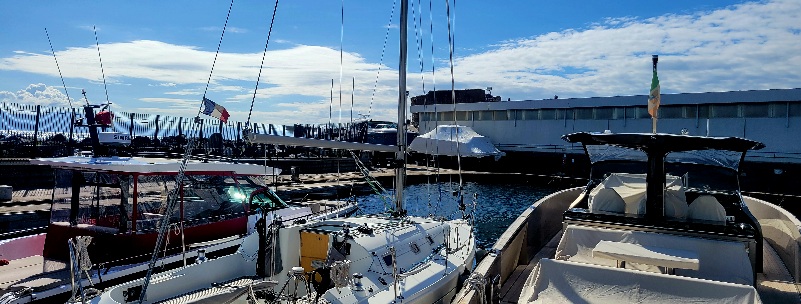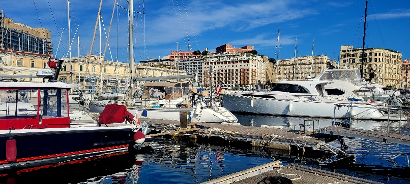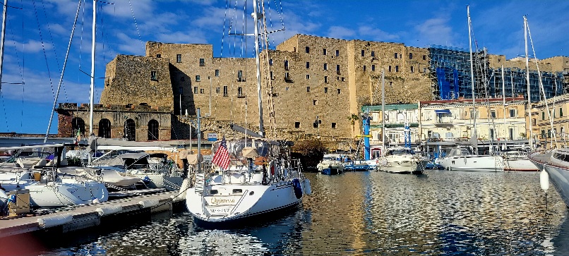 As I sit in the cockpit, the view to the north is boat harbor in the foreground and then the elegant, sun-kissed buildings of Naples.