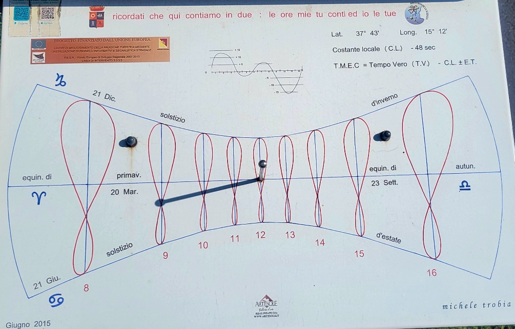 We discovered this informational sign next to the harbor at Porto dell’Etna, (next to a volcano, naturally). Looking at the sketches and recalling a few Latin roots, you can discern that the display is about the changing of the seasons, and more. I honestly haven’t tried to decipher the details, but it looks like there are tides, zodiac signs, geographic coordinates, and dates. The top sin-wave thingie could be a tidal chart, and your guess is better than mine about the meaning of TMEC = TV – CL +/- ET (Tempo Vero would be true time).