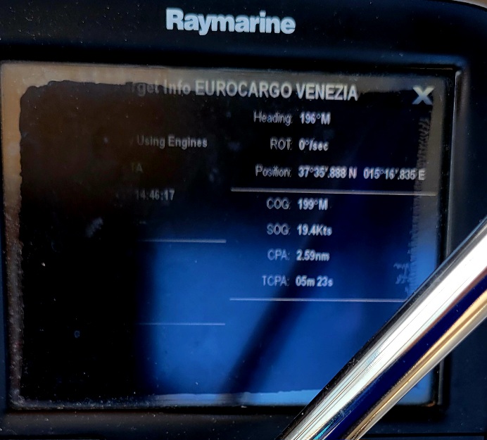 Here is what we learn: it is a cargo ship, the EUROCARGO VENEZIA. It is traveling from IT LIV (wherever that is) to IT CTA, which I assume is Catania, right near where we were. (This would be the Catania in Sicily, by the way, sitting right under a very shrouded Mt. Etna, which apparently has been quite busy erupting recently.) The VENEZIA is 200 meters long and 25 meters wide, with a draft of 8 meters. Clearly, we want to keep our distance, which is why the next information is critical. There is information about the ship’s bearing (direction of travel) and velocity, 19.4 knots, nearly 3 times our current speed. But here are the numbers I look for: CPA: 2.59nm and TCPA: 05m23s. This means that if both vessels maintain their course and speed, the nearest we will be to the VENEZIA will be two and a half nautical miles, and it will happen in just over 5 minutes. No worries. If the Closest Point of Approach is under a mile, we will decide whether to make a slight course adjustment to keep the distance comfortable. This is not a big deal in the daytime, but it’s comforting at night to know we can avoid close encounters.