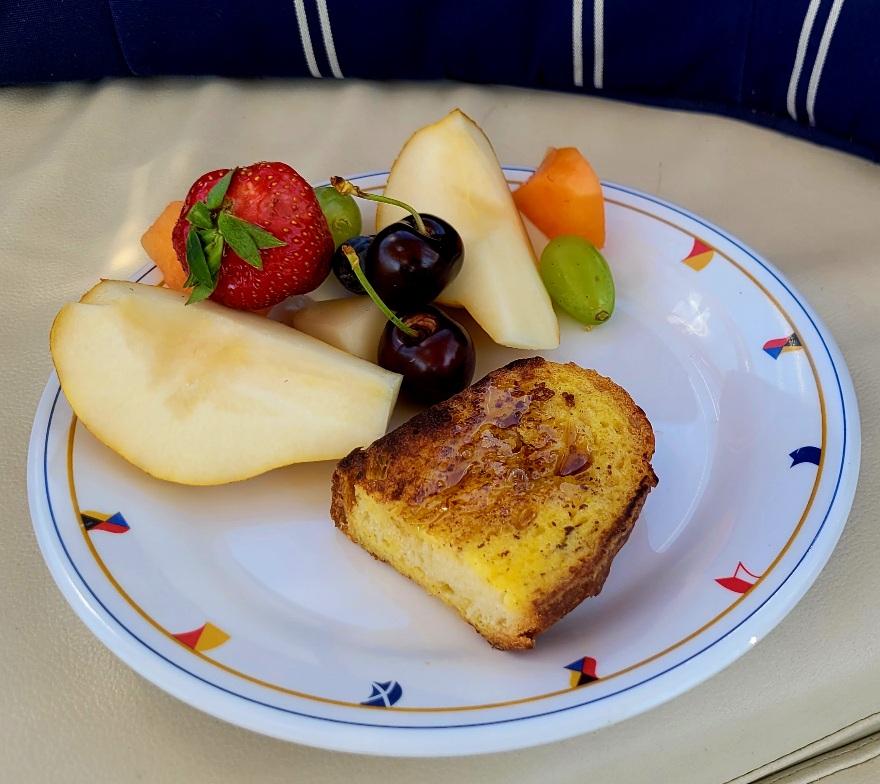 All this to say we returned to the boat and found ourselves unable to face the chores ahead due to being ravenous. Hangry is not a pretty look, so it was time to rummage up Second Breakfast, consisting of leftover French toast and very fresh fruit. And if that doesn’t hold us off until lunch, we can always scrounge for Elevensies