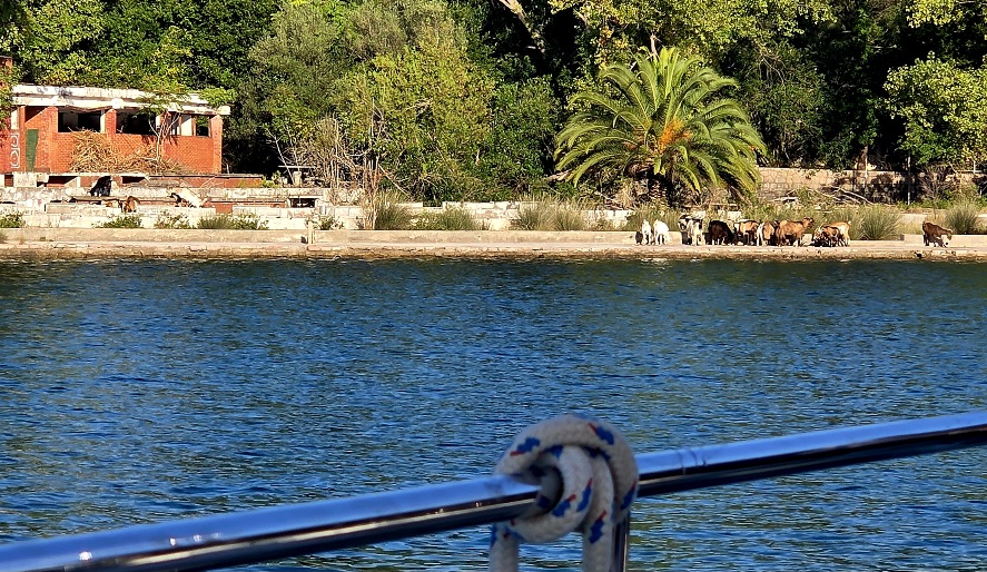 After several nights in marinas and towns, we were thrilled to pull into a quiet bay for a peaceful night closer to nature. But this bay was not always quiet; in decades past it was a bustling Club Med. The resort did not last; now only goats enjoy the ambiance of the sea wall, the terraces, the bar, the exclusive facilities, the wrap-around luxury.