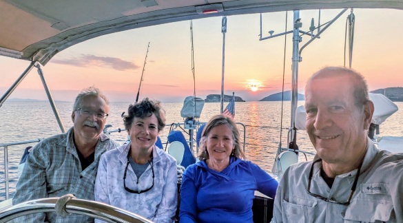 A lot of the fun for John and me was introducing Barbara and Steve to sailing life, and of course, sailing vocabulary—not the salty language kind, but the “why use a normal land word when there’s a specialized boaty word” kind. The kitchen is the galley, the floor is the sole, right is starboard, left is port, and there is no such thing as a rope—that sort of thing. I enjoyed lobbing new words at Steve so fast that he just started making up his own terms. A passerelle became a pasadena and a binnacle a barnacle, and pretty soon we were just pointing to things and busting out laughing.