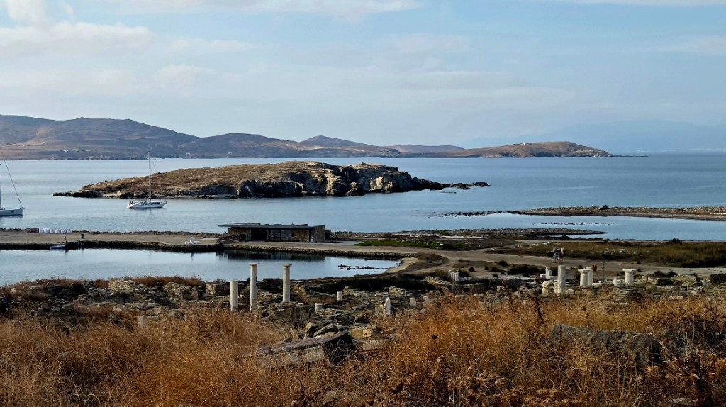 The Mediterranean has at times frustrated us by presenting days with no wind, or too much, or wind right on the nose, but we got in a few passages under sail that were a lot of fun. We visited small harbors, quiet bays, and town quays, but hands down our best visit was to the island of Delos, which is central to the Cyclades group and, while now uninhabited, is the site of extensive ruins of an important city from centuries past. We spent an afternoon there wandering among pillars, streets, dwellings, statuary, mosaics, and other evidence of a once-thriving metropolis (now there’s a good Greek word). We had the place nearly to ourselves; in the photo, you can see Quintessa waiting for us to return.
