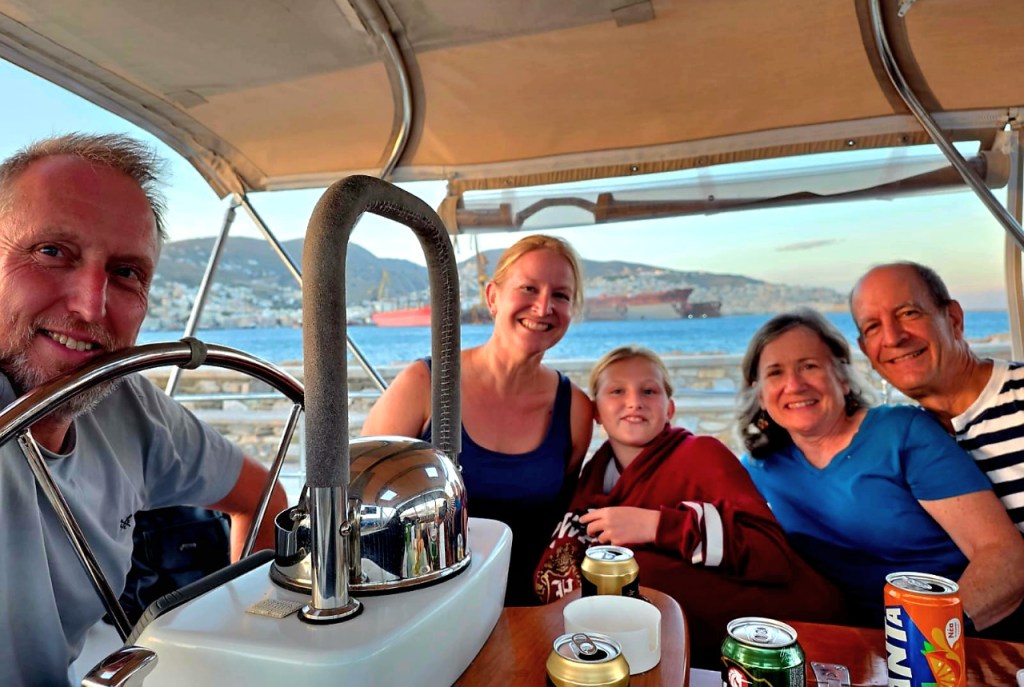 We met Dave and Emily and their 10-year-old daughter Jessica at the city quay in Ermoupoli, and immediately began to geek out on examining each other’s boats. When the boats were ordered two decades ago, the original buyers were able to choose from various options for interior configuration, rigging, accessories, etc, not unlike ordering a new automobile. And of course, subsequent owners (each boat is now on her third) made additions and modifications. Therefore the five of us madly pursued a game of “spot the differences” between the boats: