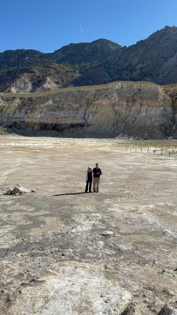 The best time for a land excursion is when the sea is being ugly. This being November, the wind began to blow 30-40 knots this week and whip up some 2 meter seas in the Dodecanese. We found shelter in a charming town harbor on the island of Nisyros, which is most famous for being a volcano. With Quintessa safely stowed, the obvious thing to do was rent a car and head for the crater.