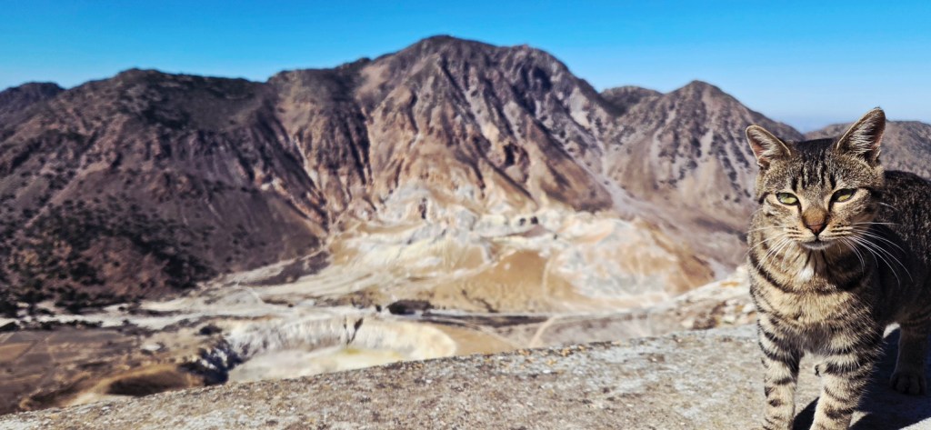 After visiting the crater, we drove up, up, up to an enchanting white and blue town called Nikia, and wandered its winding streets, peeking into garden courtyards and crooked alleyways. We saw no other travelers and very few residents in the town, but when we reached the city wall, this resident cat pointed out to us that Nikia has the unique distinction of being perhaps the only town on the planet that has its own view into a geothermally active crater.
