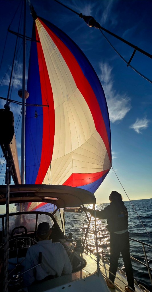 On a day when the winds were much lighter, we tried out the asymmetrical spinnaker. It performed perfectly, pulling us along at 3 knots, which is not bad in only 6 knots of wind. Again, Sara’s expertise and teaching skills helped make this happen.