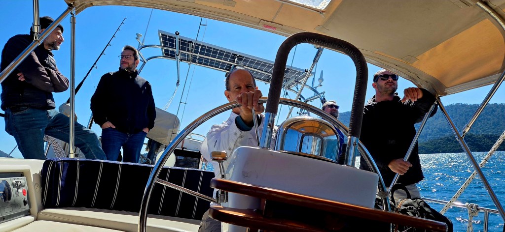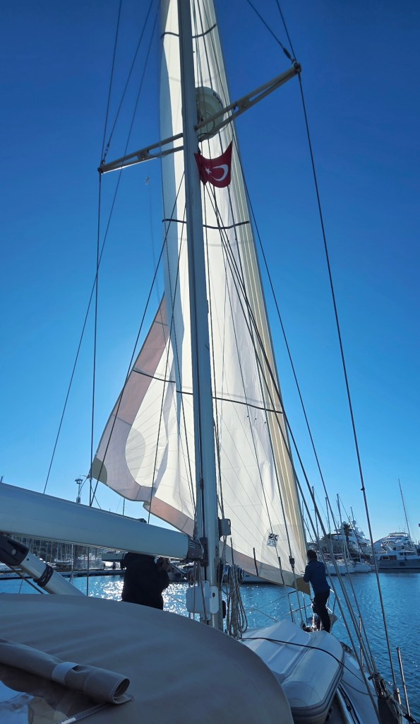 New Sail Day was very exciting. The sailmakers put up the sail at the dock in light wind. Everything fit perfectly when the sail was installed, so we scheduled the sea trial for that afternoon. The wind got frisky, and we had a great crew: three people from UK Sailmakers and also the rigger, who had put heart and soul to the task of renewing the furler and other rigging. We got out on the water of Marmaris Bay and had a short but glorious sail. John was at the helm and I didn’t have to (get to) do a thing, because these guys were so jazzed to be out there and test everything. Thumbs up to the new sail! We heard only one complaint from our new friends: “You know, you really need to replace that main. It’s stretched out.” Yeah, we know. One thing at a time.