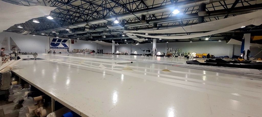 Today’s new shiny item is the foresail. Quintessa was still performing well with all of her original sails, although the two main ones were weary and stretched out. We decided to replace the foresail, a 130% genoa that has served us well. We visited the sail loft of UK Sailmakers, a company that is dedicated to sailing and the craft of creating quality sails. Being a seamstress, I was gobsmacked by the space they inhabit, which, incidentally, is the second floor of a building above an amazing, busy local farmer’s market that occupies an entire block—another story for another day. The place where the sails are cut, sewn, cleaned, and mended is amazing. The sailmakers are seated with at sewing stations that are built into the enormous table, where they do precision work.