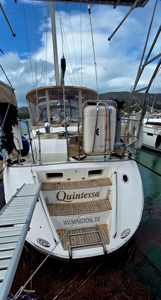 What is new about our arrangement is that for whatever reason, Quintessa’s life raft was formerly located in a different place: inside the rail and flat on the back deck. This was always puzzling to us because the device in its frame was not only difficult to deploy into the water, it also was seriously bolted to the deck right over another bit of safety equipment.